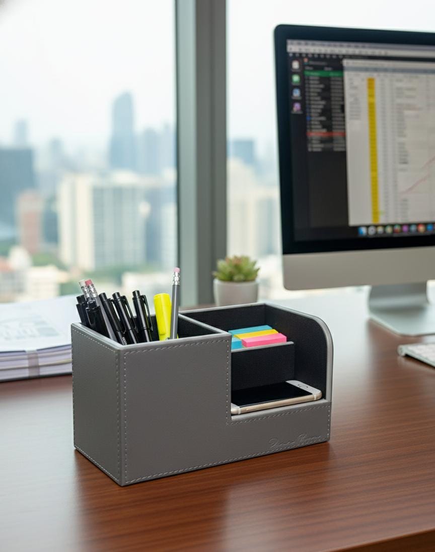Keep your space organized and elegant with the Leatherette Remote/Stationery Holder — a perfect blend of functionality and style. Crafted from premium PU leatherette, this versatile holder is designed to neatly store your TV remotes, mobile phones, pens, scissors, and other desk essentials in one place.